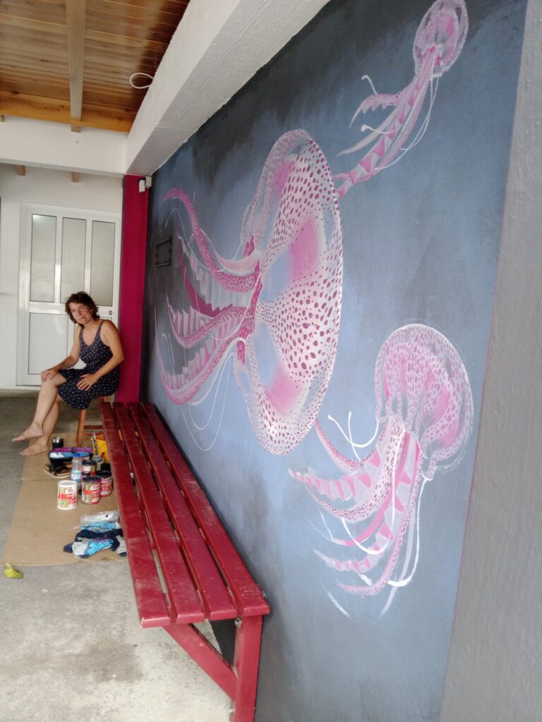 J’ai travaillé sur différents grands formats, seule ou en collaboration. Les murs, les voiles, les bâtiments … peindre en grand, ça dérouille le corps ! Ça ouvre les bras, enfin on bouge en peignant.