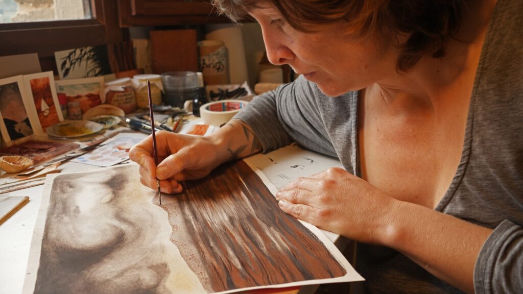 Profitant de l’itinérance à la voile et de mon intérêt pour le minéral et le végétal, j’ai glané pendant des années de quoi faire des couleurs. En 2024, après des dizaines et des dizaines de tests « à la maison », je participe à un stage de Couleur garance qui me confirme que cet univers mérite d’être exploré encore et encore. Depuis, je peins avec mes couleurs comme on mangerait les légumes de son jardin : avec un grand plaisir et un regard très subjectif, un attachement particulier et un rapport différent aux nuances.